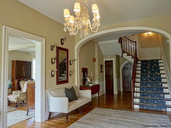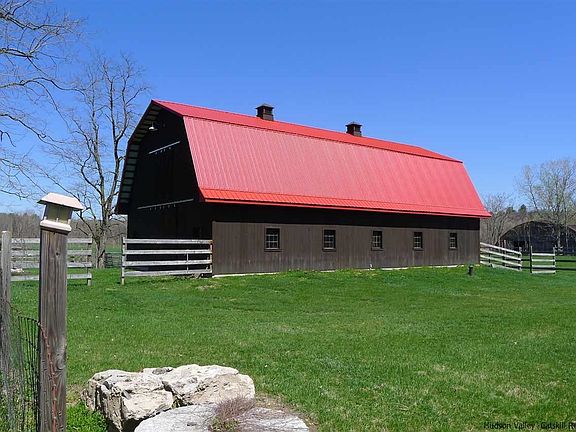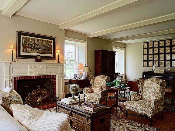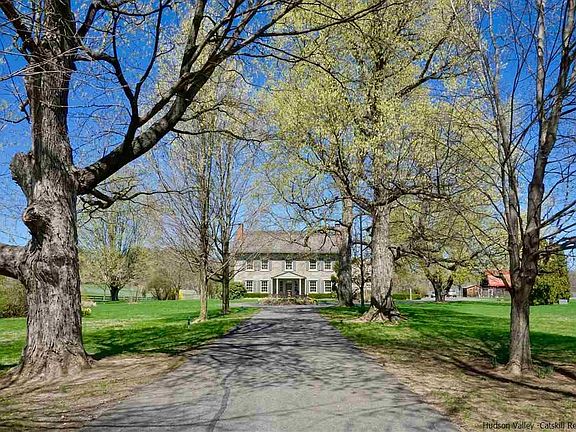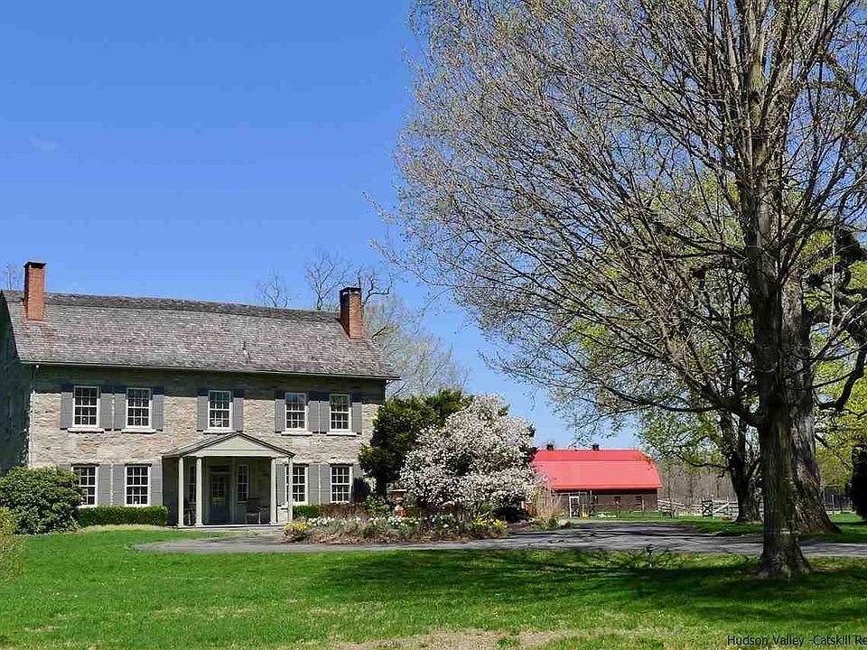 Classic, grand and gracious, this stone center-hall colonial dates to 1805 and was "modernized" in the 1930s. Large rooms, ten-foot ceilings and generous proportions are evident throughout, as is the care with which this important home has been maintained and loved through the years. Wood-burning fireplaces grace the 34-foot long living room, formal dining room and richly paneled den. All of the bedrooms are spacious and the upstairs landing is a room of its own. What was once a maid's room with its own bathroom sits at the top of the back staircase, which leads down to the service area and laundry room. The top floor of the house, a wood-paneled walk-up attic, is currently set up as a game room and could easily function as an elegant home office, studio, gym, media room or stay exactly as it is. Out on the property, marvels abound. There's a new 11-stall black barn with a red metal roof that has electric service, water, and a concrete floor. Fenced pastures have recently been home to dairy cows; the farmland is currently used for growing hay and there's an old quonset hut that once housed sheep. The spring-fed pond is home to many species of waterfowl and the Rochester Creek flows through the property as well. With a flexible zoning classification the potential for this property is not limited to residential use.