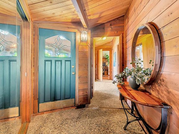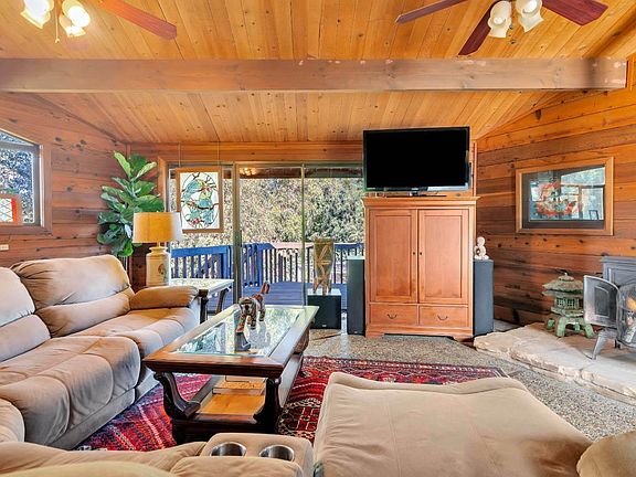 Welcome to this 3 bedroom, 2 full bathroom, 1,952 square foot home situated at the top of a 2.5 acre lot. This amazing property will leave you breathless with all the gorgeous scenery, inside and out! The home was constructed with 4x6 double tongue and groove cedar. Just beyond the above-ground pool surrounded by a wooden deck, you will find the front door that leads to the welcoming foyer. Polished pebble flooring flows throughout most of the home. A woodburning fireplace is centrally located in the living room that is adjacent to the kitchen that features plenty of counter and storage space, including a walk-in pantry. There is also a sunroom/terrarium with thriving banana trees and sliding glass doors that lead to the pool. Through the laundry room, youll find the master bedroom with a walk-in closet and ensuite bathroom. Breathtaking views of the pool and canyon can be enjoyed from the master bedroom. The partial wrap-around deck is perfect for entertaining or relaxing. Youll also be able to enjoy a grassy area for play, a charming garden with established table grape vines, a garden shed, a chicken coop and still have enough room for a horse! There is also ample storage space in the basement and attached two-car garage.