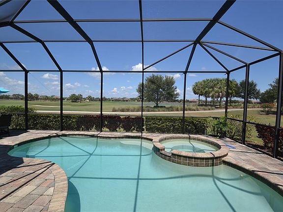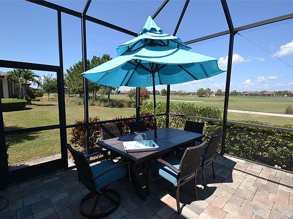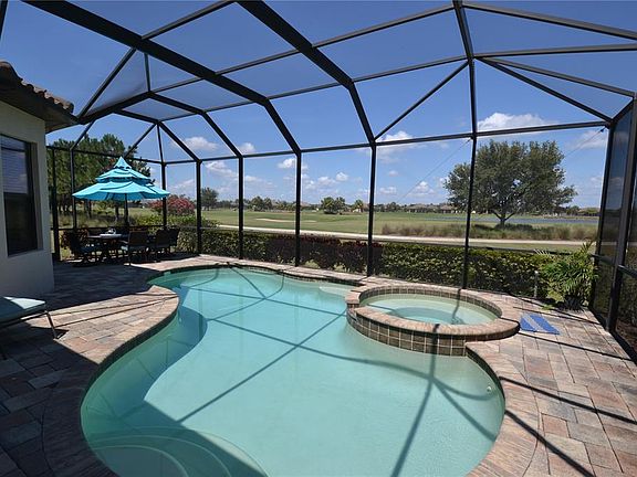 Look no further! Curb appeal galore in this Taylor Morrison Lazio bundled golf home with pool overlooking the golf course in Lakewood Ranch's Esplanade. The home features 2265 sq. ft., 3 bedroom/3 bathrooms plus office/den and an attached 2-car tandem garage with room for a golf cart, paver driveway and walkways. Impact windows and doors throughout! Three-way split plan allows for privacy. Stunning landscaping and back yard with a gorgeous view of the golf course and pond behind the property. Gourmet kitchen with 42" wood cabinets, built-in wall oven, gas cooktop with griddle, stainless range hood, granite countertops, closet pantry, enormous island with cabinets and bar sink, wine fridge and tile backsplash. Stunning tray ceilings and lovely tile flooring throughout much of the main living areas. Enjoy the luxurious pool and back yard landscaping from the covered/screened-in lanai featuring a paver deck. Master bedroom features a master bathroom with double vanity, large stall shower and lots of closet space. Esplanade is an impressive private gated community with charming architecture and numerous amenities including resort style club house, pool, tennis, pickleball, spa, etc. From this home, it's a short distance to all of Lakewood Ranch, Sarasota and Bradenton's many attractions; Gulf beaches, boating, local shopping in a true downtown, restaurants and Interstate-75. A great commute to points north and south. All appliances stay with the home! Make this beautiful home your own!
