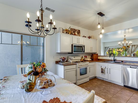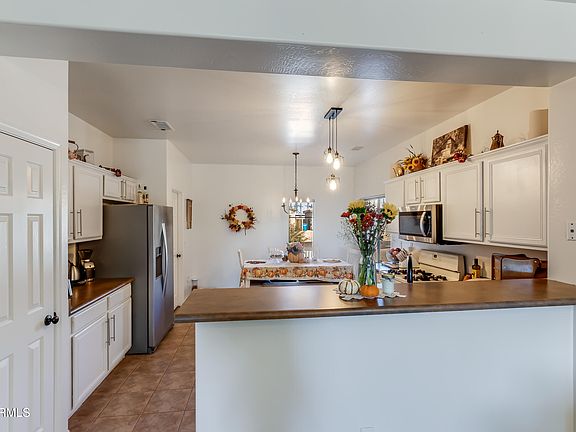 This home has tile floor throughout excluding the bedrooms which have carpet. The kitchen has newly painted cabinetry with modern nickel hardware, a gas stove, and stainless steel fridge/dishwasher. Both full bathrooms are original with cultured marble countertops and fiberglass shower and tub. The rear yard offers a covered patio and desert landscaping with two large mesquite trees. Home has a solar lease that will need to be transferred to buyer