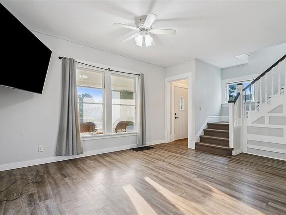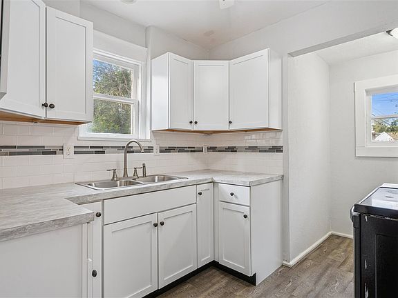 Modern countersCrisp white cabinetryCloset spaceUpdated kitchenSpacious bedroomsNatural lightCharming front porch