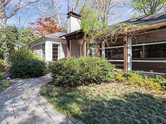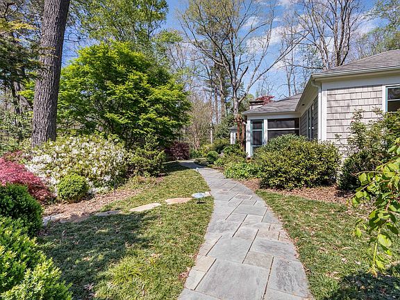 Elegant, comfortable one-level home on private lot, within walking distance to UNC campus/downtown CH. Stunning gardens surround the home w/many hardwood trees incl a magnificent Beech, mature Camellias, Redbuds, Dogwoods, Quince, Cherry Tree, Azaleas, walking paths, stone walls, garden shed, more. Excellent floor plan for entertaining-inviting foyer & large living room w/pine paneling, fireplace, hardwood floors. Living room picture window looks over front gardens. Dining room has corner cabinets, crown molding & floor-to-ceiling windows. Eat-in kitchen w/original knotty pine cabinetry, stainless appliances, built-in buffet, corner windows w/window seats. Sunroom/den, with brick floor, skylights & fireplace, has two sets of French doors that open to brick patio & back garden. Master suite w/two closets & private bath w/oversized shower & two vanity areas. Separate dressing room. Second bedroom features plantation shutters. Second bath has whirlpool tub & separate shower. Study/Bedroom 3 has built-in bookshelves. Basement/mechanical/storage area w/half bath. Floored attic. Covered breezeway to detached studio/ofc.