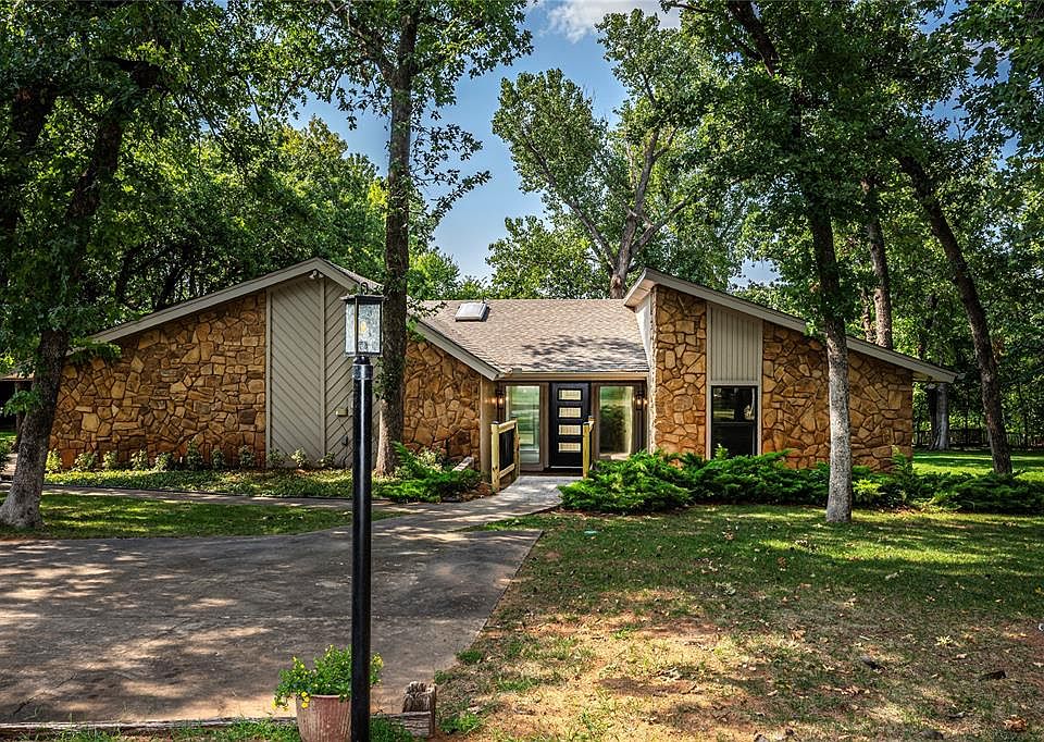 Totally remodeled inside and outside 3b2B 2269 sqft home on 1.30 (mol) wooded acres watershed pond view in NE Edmond. Country living w/NO HOA! Just 1 mile north of Waterloo on Broadway; **Edmond schools**, quick 10 min drive to shopping! Beautiful new interior blends modern design with 1979 architectural charm. 5 skylights throughout the home provide amazing natural light complemented perfectly by all new LED lighting. Distinctive, Super cool open air atrium pre-wired for your hot tub or great for raised gardens too, picnic table or extra entertainment area. No cookie cutter floor plan here! New open concept kitchen/dining/living room incredible 9ft island with completely new chefs kitchen-all new cabinetry, exquisite 3cm White Nile granite, electric downdraft Jenn Air cooktop, new builtin oven and microwave, gorgeous farm sink, all new lighting, remote control built in electric fireplace in the living room-all with an incredible view of the HUGE NEW 1100+/- sqft modern wood deck. All new flooring throughout including and new carpet in all 3 bedrooms. Buyers will love entering the elegant master bath through the modern farm house barn door to a luxurious double size shower, lovely granite new cabinetry, fixtures, and large closet. Guest bath sporting all new cabinetry, shower, granite and modern fixtures. Professionally painted inside & out. Updated HVAC, new water heater, plumbing fixtures, all new siding, rain gutters, spray foam insulation, updated lighting including beautiful driveway lamp posts all with automatic dawn to dusk timers! Private Well (no city water bills!), septic, garage floor storm cellar, whole yard 15 zone sprinkler system! 2 outbuildings included & room for more or even a shop! A unique property and great setup for the Buyer looking for a home with loads of character. Several resident deer and turkeys will even welcome you home from time to time. Move in Ready and Easy to show! Seller is a current OK real estate licensee #157918.