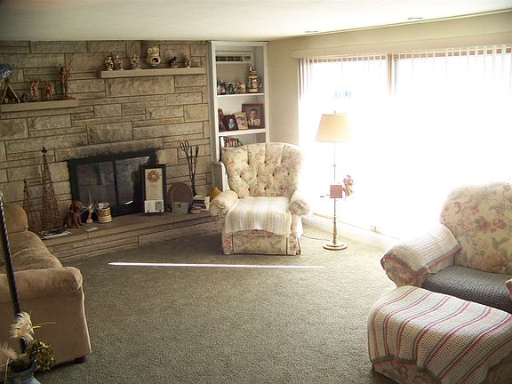 3 bedrooms, 2 full baths, stone ranch on a cul-de-sac. Spacious living has new carpeting, lots of windows, built-in shelving and wood-burning fireplace. Dining room has built-in, and slider doors to yard and patio. Kitchen has appliances. Home has newer windows, added insulation, roof on house and barn were new in 2013. There is 24 x 28 pole barn with loft and 28 ft covered patio. Nicely landscaped yard with numerous perennials.