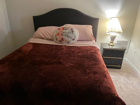 -Furnished bedroom includes a comfortable bed, dresser, and nightstand.