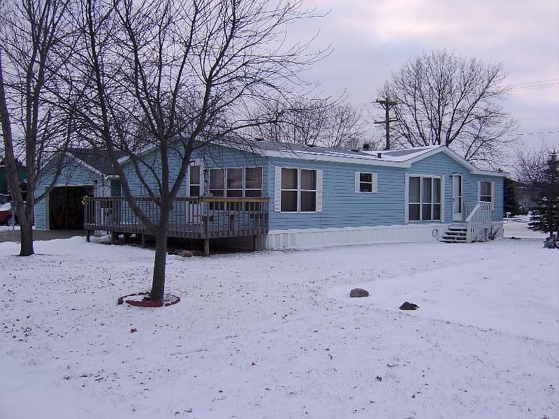 Manufactured Home & Double Garage Double wide manufactured home with 3 bedrooms, 2 full bathrooms, vaulted ceiling and large living room/ dining area. Vinyl siding. Updates include shingles, carpet, window treatments, water heater and interior paint. Convenient laundry closet with cabinets. Unit is located on a rented lot.
