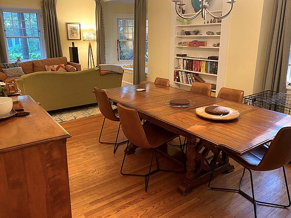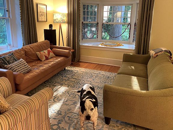 Comfortable fully furnished house with wrap-around porch on idyllic side street in Swarthmore. Spacious and private with open foyer, bay windows, built-in bookshelves, fully stocked kitchen, porch seating with ceiling fans, and a finished attic and basement. The first floor of this updated century-old single family house contains a living and dining room, music and art room, kitchen with island, mudroom, half bath, and walk-in pantry. The second floor has two bedrooms that share a Jack-and-Jill bathroom with radiant floor heating and laundry. Also on the second floor is a third bedroom with a hall bathroom, and a study. The third-floor attic bedroom runs the length of the house and has a separate small dressing room. The finished basement contains an additional bedroom, a family room with toy and game closets, big screen TV, and a full bathroom. Off street parking behind the house and a large landscaped yard with a fenced vegetable garden. Garage access and finished storage space above the garage available. Hardwood flooring on the first floor, carpeting on the second and third floors. Radiator heat and central air conditioning. Owners will want to store personal belongings in one room in the house, to be negotiated depending on the needs of the tenant. Centrally located among commuting routes, shopping and is close to the Swarthmore College campus. Twelve minute walk to the SEPTA train station and downtown Swarthmore. Located in the Wallingford-Swarthmore School District. Available for a six month furnished rental from January 25th, 2022 until late July. Owner pays for high speed internet, water, garbage and recycling, and gas and electric up to $400/month. Also included is a biweekly house cleaning service. Tenant responsible for mowing the lawn. Credit check and security deposit required. No smoking allowed. Pets negotiable.