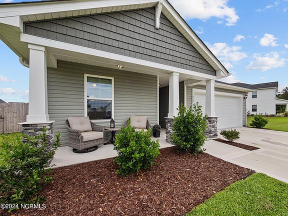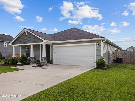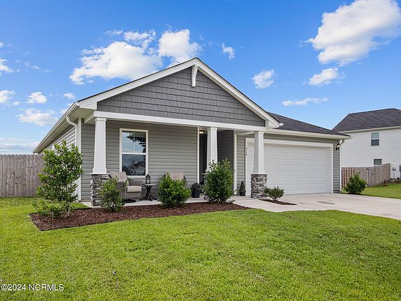 Sometimes, a home can be 'better than new'! This one will fit that description and is located in the super popular Hunters Creek area. This 'almost new construction' home is a single story with lots of space. Over 1800 square feet plus gorgeous outdoor spaces. The home features 4-bedrooms with 2 full bathrooms and a 2-car garage. There is a relaxing covered front porch and at the rear the large deck has a lovely pergola and it's a perfect grilling and entertaining spot. There's also a stylish firepit to gather around to relax and enjoy PLUS a large storage building to store your outdoor things. The back yard is also fenced to offer privacy. When you enter the home, you'll notice the extra wide foyer that leads to two guest rooms and a guest bath and access door to garage which offers space for 2 cars as well as wired connection for your generator. Further down the hall is an additional bedroom and laundry room. All of this leads to a dream kitchen with plenty of cabinet and counter spaces, including an island for added seating. Adjacent to this fabulous kitchen are the spacious living room and dining area. The principal suite is just off the living room and includes a walk in closet and luxurious bath. Property is close to Camp Lejeune and nearby restaurants and shopping.