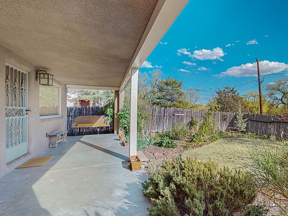 Downtown location and blocks to The Plaza from this desirable north side neighborhood. Set back from the street and nestled on a uphill landscaped lot with a long driveway, capable of three off-street tandem parking spaces, that ends at the one car garage with direct access into the kitchen. This vintage Territorial has large, oversized rooms, mint condition hardwood floors throughout, fireplace in LR, evaporative cooling, newly installed granite counters in kitchen, generous sized utility room with storage galore, hot-water baseboard heat and three coffered skylights. Property is fully enclosed with a front covered portal which runs the length of the house and a nicely proportioned coyote-fenced landscaped yard. A rarity, is the ginormous walled backyard with a storage/she shed on the upper flat level. With City Approval, a perfect spot for an ADU or studio. This property is primo for it's privacy with two huge landscaped gardens comprised of numerous flowers and fruit trees.