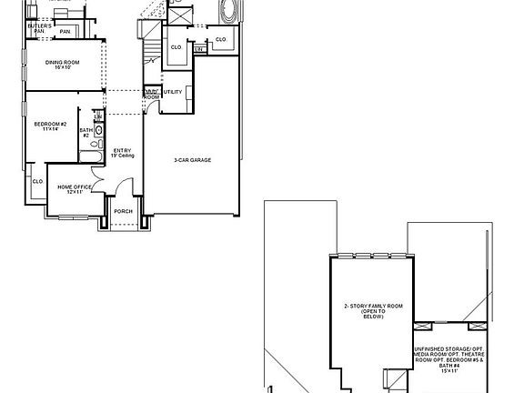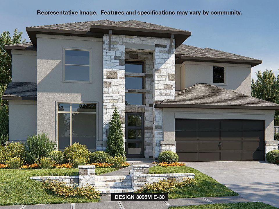 Home office with French doors set at two-story entry. Formal dining room. Two-story family room opens to kitchen and morning area. Kitchen features deep walk-in pantry, Butler's pantry and large island with built-in seating space. Family room features wall of windows. First-floor primary suite includes bedroom with curved wall of windows and 12-foot ceiling. Dual vanities, garden tub, separate glass enclosed shower and two walk-in closets in primary bath. An additional bedroom is downstairs. Game room and two secondary bedrooms are upstairs. Covered backyard patio. Mud room off three-car garage.