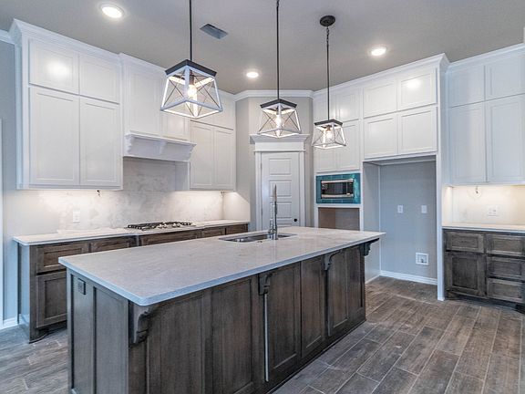 The Hazel floorplan has a total of 2,120 Sq Ft of living space (including 220 sq ft of outdoor living space with wood burning fireplace and TV hookups) 4 bedrooms, 2 full bath. Living area includes a gorgeous corner fireplace with stack stone, 3 large windows and transom package, great source of natural light, and a barndoor to separate off 2 spare bedrooms! Kitchen has a large island including tons of storage with a stainless steel sink, 3CM counter tops, gas cooktop and built in electric oven and microwave, decorative tile back splash, and a corner pantry. Wood-Look Tile in the Kitchen, Living, dining, entryway and all hallways. Master suite features a boxed ceiling detail with uplighting and bathroom featuring separate vanities, large walk in shower, whirlpool tub and spacious walk in closet with connection to the utility room! The exterior of this house has fully sodded front and back yards with in ground sprinkler systems and front yard has fully landscaped flower beds. Home has Rinnai Tankless water heater, whole home air purification system, R-44 insulation and Solar-boards, insuring energy efficiency, storm shelter for safety. 1 year in-house builders warranty. HERS Rating average of 49.