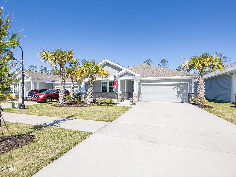 Washer, dryer, refrigerator and termite bond included in this brand new construction without the new construction wait in the established portion of the Breakfast Point neighborhood! This beautiful, well taken care of, Shearwater Gold floorplan home was built in 2021 and looks as new now as the day it was finished! Built by Southern Coastal Homes, it is a 3/2 home with a two car garage and large backyard that backs up to preserve land and is close to TAFB, the world's most beautiful beaches, shopping, schools, and all the rest Panama City Beach has to offer! Inside, the features of this coastal inspired home include a large foyer entrance, wide open Great Room and floor plan, chef's kitchen with 4 burner gas cooktop, center island, custom cabinetry with soft close drawers and stainless steel appliances, tray ceilings in the master suite and living area, huge tiled shower, double vanity and very large walk-in closet. The large covered patio and quiet backyard just off Great Room makes this home perfect for entertaining. Outside - This home features a 2 car garage, covered lanai, covered front porch, fully landscaped yard with Rain Bird sprinkler system. This home includes upgraded finishes including Luxury vinyl plank flooring, custom cabinets, quartz solid surface counter tops, tile back splash, Whirlpool stainless steel ''Gourmet Kitchen'' appliances, stainless sink, transferrable termite bond, and much more! Do not wait to schedule your showing and live the Florida Coastal Lifestyle!