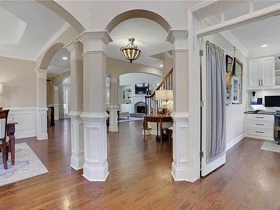 Sparkling poolExtended islandSoaring ceilingsWaterfall featurePrivate officeSpacious primary suiteRich hardwood floors