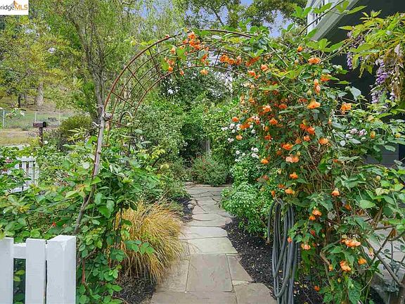 This serene garden home has a large leveled yard and a peaceful creek side setting. Features include: Refinished hardwood floors, New double pane windows, Updated kitchen with Bay window, Stone counters, Stainless GE range, Stainless Whirlpool refrigerator with water/ice dispenser, Stainless range hood, Ceramic tile floors, Subway tile backsplash, Updated Master Bathroom, Paneled shower walls, New vanity, New fixture, New windows, New elegant lighting fixtures, Bonus garage office with new wood floor, 4 Parking spaces. Private level Creekside yard with Vegetable planter, spacious deck, mature trees and plantings. * Livable Sq. Ft. was taken from appraiser's measurement. Bedroom and bath count differ from public records. ** Lot Sq. Ft. was taken from public records.