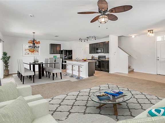 - Interior Features: Ceiling Fans(s), High Ceiling(s), Open Floorplan, Walk-In Closet(s), Solid Wood Cabinets, Kitchen/Family Room Combo, Living Room/Dining Room Combo, Solid Surface Counters, Window Treatments