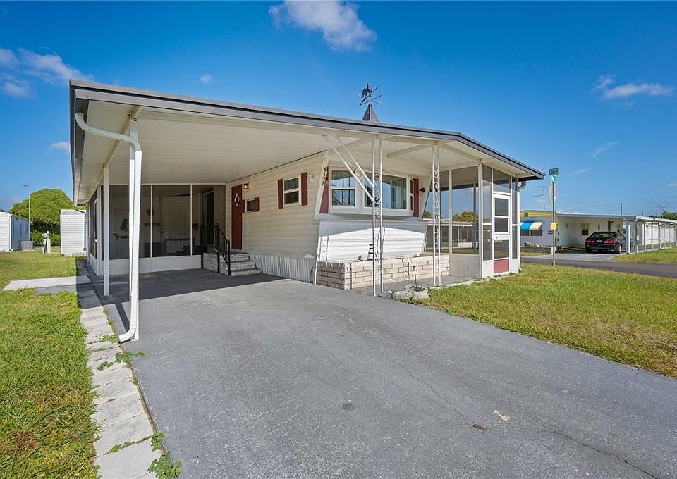 Are you looking for a warm, sunny place to escape the snowy north for a few months, or a forever home? Look no further than Betmar Acres active 55+ golf community where you own the land with a low annual community fee of $423. This well-maintained UPDATED 2BR/1BA home is located on a corner lot. Eye catching curb appeal. You enter the main home through the spacious kitchen/dining room with a ceiling fans and open floor plan to living room. The kitchen is spacious with ample wood cupboards and counter space. Dishwasher was just installed in 2023, gas range, and center island. The open concept home has Florida room attached and open with main living area. The master bedroom is roomy enough for a queen size bed and all the furniture that would go with it and has a large closet. The main bathroom is conveniently located with a double vanity, high toilet, and tub/shower combo. The laundry is located outside off the screen room which is a great location to enjoy a nice breeze day or great for entertain. This home has TPO membrane roof 2016, double pane windows, 2011 central AC/heating system, and much more! Don't forget it's near the 27 holes of golf, 2 swimming pools and 2 hot tubs along with 3 clubhouses, a library, walking paths, game rooms (Billiards, Table Tennis, Board Games) miniature golf, enclosed shuffleboard courts, tennis courts, pickle-ball courts, basketball court, Bocce courts, and Bingo. Schedule your appointment today and don't let this one get away! L