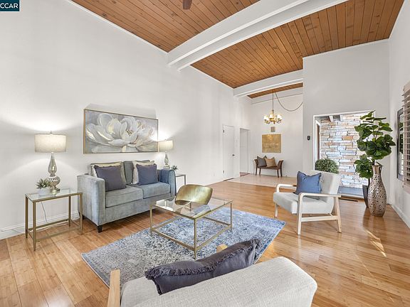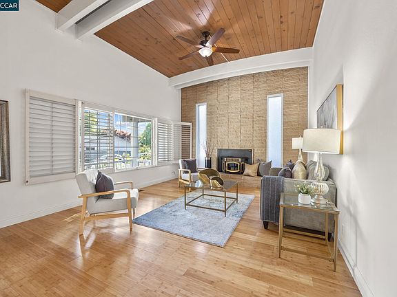 Beautifully updated 3-bedroom, 2-bathroom home on a flat 9,448 square foot lot. This meticulously maintained home offers 1,566 square feet of living space, enhanced by newer bamboo flooring, LED lighting, dual-pane windows, floor to ceiling stone fireplace, and modern bathroom updates. With a peaceful front porch, this thoughtfully designed rancher style home includes two spacious living areas, updated eat-in kitchen and backyard retreat. Outdoors, enjoy a landscaped yard with mature trees and colorful flowers, a new perimeter fence, and a sparkling private pool A newer roof (2012) and compliant sewer lateral add value and peace of mind. Located minutes from Orinda and within easy reach of the San Pablo Reservoir, this home offers excellent access to hiking, boating, and other recreational activities. Enjoy proximity to quality dining options and everyday conveniences, all while living in a quiet, established neighborhood.