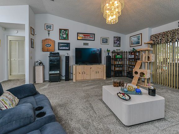 Loads of space in this happy home! Mature landscaping surrounds the home and welcomes you with a tropical atmosphere. Enter through the double doors to the open sunken living room, and a soaring cathedral ceiling. Comfortable carpeting flows through the living room and bedrooms. A great size kitchen with cabinets surrounding and a breakfast bar overlooking the dining area. The stone wood burning fireplace sets a comforting mood when relaxing in the bonus family room. The guest bedrooms hold great space and a ceiling fan above. The soaring ceiling in the master bedroom opens up the atmosphere and the size of the room can accommodate large furniture. Slider door access to the lanai from the master bedroom is a plus as well. Dual sinks are provided in the master bath followed by a very large walk-in shower. The fantastic pool area is a spot you will not want to leave. This area was built for entertaining with all the space available. The irrigation well is also hooked up to the pool and outside shower to cut down on water costs. This property backs up to a golf course for relaxing views while you float your day away in the refreshing pool. The a/c unit is from 2011 and the roof was installed in 2019. A terrific find! Come view today.