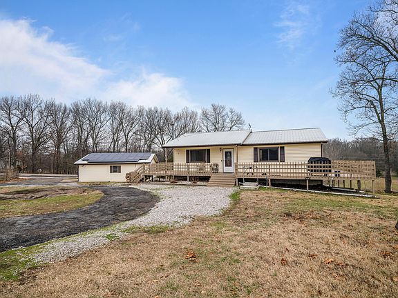 Enjoy low-maintenance living and low-cost utility bills in this 4 bed/2 bath walk-out basement home! Featuring over 5 acres of land, solar panels, a metal roof, wrap-around deck, circle drive, and more! Inside, discover a front living room that flows nicely into the dining room. The kitchen offers granite counters w/an undermount sink and exterior access to the deck. Main floor primary bedroom includes an attached bathroom and walk-in closet. The main floor is completed by a 2nd bedroom w/walk-in closet. The walk-out basement features 2 bedrooms, a full bathroom, laundry room, and large recreation room with wood burning stove. Outside, enjoy wonderful view on the deck, the detached 2 car garage w/solar panels, and a 2 car carport. Located SE of Joplin with quick access to I-49.