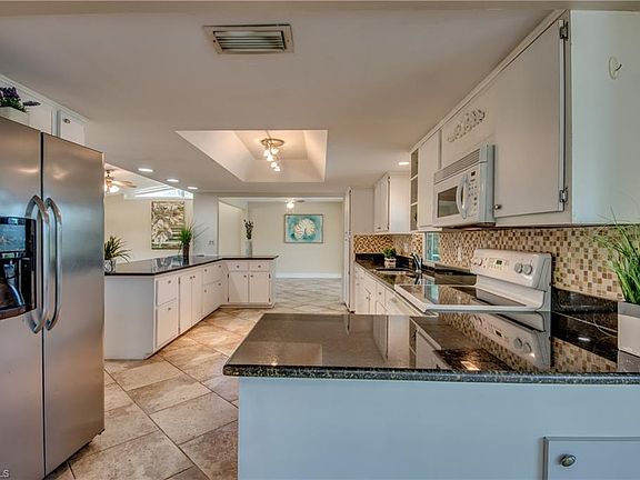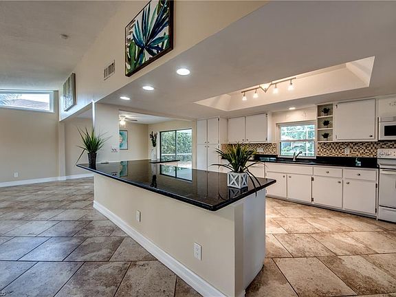 BOATERS OASIS- WATERFRONT POOL HOME WITH SUNSETS! Only minutes to the river & yacht club. Boat dock & lift. Everything you are looking for in a spacious home with plenty of entertainment area. Almost 3,000 sq ft under air includes 3+ bedrooms, 3 baths (updated) & tons of storage. Double front doors open to the great room with vaulted ceilings. 2nd floor open terrace for sun bathing & beautiful sunsets (western exposure). Several sets of sliding glass doors lead to the covered lanai featuring a caged pool over looking the water. Roomy kitchen with granite counters & major appliances. High demand location. Central water & sewer.