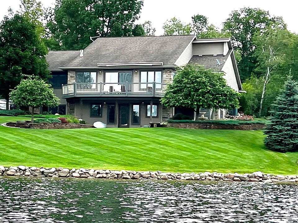 This stunning custom waterfront home, designed for a family who loves entertaining, offers approximately 3,328 SF of luxurious living space. It features 4 bedrooms, 2.5 baths, and top-grade materials and craftsmanship throughout. Enter through a beautiful cultured stone entrance into an open foyer with slate flooring and a spacious great room. The home's design maximizes natural light with windows encircling the great room, providing breathtaking views of both Lake Lancelot and Lake Lancer. The property is beautifully landscaped and boasts 100 feet of frontage on Lake Lancelot. This is an incredible year round home has a full custom kitchen featuring cherry wood cabinets, granite counters, pantry, slate flooring, JennAir range, automatic/easy close drawers, flat pull outs for pans, lazy Susan and more. Breakfast nook and formal dining area with picture perfect view of both waterfronts. There is a 2 sided Granite fireplace for living room and master suite. Main floor laundry and Master Suite which features walk-in closet, beautiful tiled double vanity, garden tub, custom tiled walk-in shower and marble floors. Wide staircase takes you to the lower level walk-out and spacious family room, 3 additional bedrooms and full bath. Family room walks out onto a beautiful landscaped patio with fountain and waterfront dock. Also attached is an oversized 3 car garage with extended 14x6 area for storage or workshop and has an easy access stairway to a partially finished bonus room above garage for additional storage or office space. Extras included: Sprinkler system, central vac, Remote operated deck awning, custom built in china hutch, Trek decking, built in ironing board, rounded wall edges, recessed lighting. Ownership gives you access to all of Sugar Springs amenities and beach clubs. Sugar Springs offer year around activities and events to keep you busy. For more info: www.SugarSprings.net Come and join us in the fun!