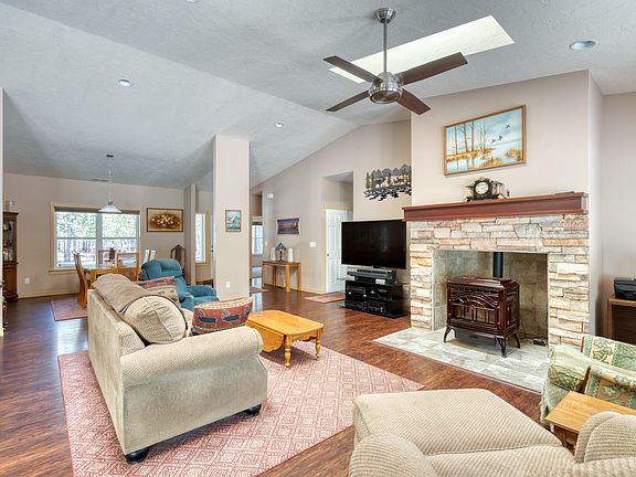 Experience nature every day in your own La Pine oasis. This custom built Adair home backs on to a forested wildlife reserve and is surrounded by BLM land. This ranch style one level home offers generously proportioned rooms, vaulted ceilings, skylights and tons of custom upgrades. There are two primary suites on opposite sides of of the home, adding privacy and making this a perfect multi generational home. Two more bedrooms, a full bath and powder room, along with a bonus room/office/den. Main open concept living area features a huge living room, kitchen and dining room, ideal for entertaining guests. Tons of extras and upgrades throughout, including ATT septic system with sand filter, 400 amp service, heated 3 car garage, large drive way and plenty of space for RV parking, fully fenced backyard, quartz countertops, eat-in bar, heated roof cables, water filtration system, sunsetter retractable shade and a hybrid water heater.