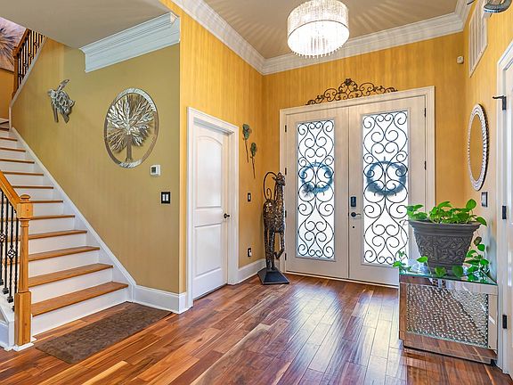 WELCOME HOME to this must see beautiful 5 bedroom, two-story home with views of the pond located in the gated community of Waterway Palms Plantation. This custom home has a dream garage that features a side golf cart door and a 24 ft. wide front entrance with one side @ 48 ft. deep. Garage is insulated, LED lighting, has a built in 2 door shelved storage closet, wall cabinets, overhead and wall shelving for all your storage needs. Walk onto the tiled front porch and enter the double glass and metal door into the spacious open floor plan with lots of natural lighting. Living area features a coffered ceiling, custom entertainment wall unit with cabinets, granite countertops and granite fireplace. Overlooking the gourmet kitchen includes a 48 inch gas stove with 48 inch vent, 6 burners, flat top and double side ovens. The wall unit includes a 3rd oven and microwave and under counter wine cooler. Walk in pantry has plenty of shelving and room for a second refrigerator or freezer. Office features a entry pocket door and space that could also be used for a nursery. Dining room features tray ceilings and bay windows for lots of natural lighting. Living area has triple glass sliding doors that leads to the tiled floor and screened in porch with tv connection with views of the pond. Enough patio space for family gatherings and grilling. The oversized master suite includes tray ceilings, lots of windows for natural lighting and enough room for a sitting area. Double pocket doors makes entry in the glamorous oversized master ensuite featuring a free standing tub, oversized walk in shower with bench, and his and her vanities with granite countertops. The large barndoor leads you into the 15.4 x 17.2 walk-in closet featuring an island with a granite countertop, bay windows, sitting bench and laundry area. Master bedroom, ensuite and closet all have chandelier lighting with ceiling fans. Upstairs include 3 oversize bedrooms and 1 over garage room that could convert into a bedroom or another family room. The Jack and Jill bath has double sinks, granite countertops and a tiled wall bath/shower combo. A second laundry room and half bath is also upstairs. Media room includes wet bar with granite counters and under counter cabinets. French doors opens to the 3rd porch that's screened with floor tile. This home also includes outside curb scaping for added landscaping appeal, two water heaters, an under stairs complete walk in storage room with shelving, weather proof ceiling fans on all porches, mud room, outside gas line that's ready for grill hook-up and complete irrigation system. This glamorous home is move in ready!