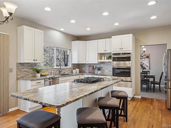 This exquisite 5 bed, 4 bath, residence in Woodgate South is perfectly positioned on a quiet cul-de-sac. Entering the home, you’re captivated by a seamless blend of elegance and warmth, as you’re greeted by a spacious foyer leading to a thoughtfully designed main floor office -- perfect for remote work or study. The heart of this home is a beautifully renovated kitchen, with a generous center island and ample cabinetry. Enjoy casual meals in the cozy breakfast nook or entertain guests in the adjoining family room, complete with a warm, inviting fireplace offering a soothing ambiance for gatherings. Venture upstairs to discover a luxurious primary suite, boasting a walk-in closet and a spa-like 5-piece ensuite designed for relaxation. Three additional spacious bedrooms and a well-appointed guest bath complete the upper level. The expansive garden level basement, features a fifth bedroom and full guest bath. Additional living space and a flex room highlight the basement. Unleash your creativity in the flex room — perfect for a home gym, playroom, or craft room. Step outside to your own outdoor haven! The enormous backyard is a canvas for your imagination, surrounded by mature trees providing both beauty and privacy. Host summer BBQ’s on the large deck or play in the vast open space. With a utility shed for extra storage, you’ll have ample storage for all activities. The residence has many recent upgrades, incl: new CertainTeed ClimateFlex roof (Dec 2023) installed on the home and backyard shed. This roof has a class 4, impact resistant shingle. Additional, recent work done, incl: freshly painted exterior, garage door and motor (featuring camera for security and utility), gutter system, and Ring doorbell. The location of this home is perfect: in the Blue Ribbon, award-winning, Cherry Creek School District, next to Cherry Creek State Park and HUGE dog park, minutes from the Denver Tech Center, and near DIA and Downtown. Don't miss this one!