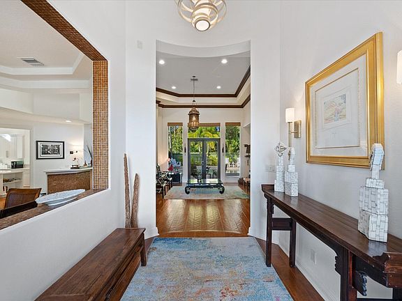 Rarely available 6 Bedroom home on a quiet culdesac in highly sought after community of San Michele. Many 2022 upgrades including new tile roof, full kitchen remodel with quartz counters, new AC, fresh paint throughout, built in appliances and more. Beautiful views from every window, this home is an entertainer's dream featuring wet bar inside and out, open floor plan, private backyard, full home entertainment with built-in speakers on first floor and automated sound system. The backyard is a Tropical Oasis with pool, spa, full kitchen and golf putting and chipping greens. Other upgrades including zoysia grass, gorgeous handscraped floors, full house generator, Italian tile accents, office built ins, upgraded master bath. Fully equipped gym, tons of in home storage and 3 car garage. Impact glass throughout (except front door and bay windows at breakfast area).