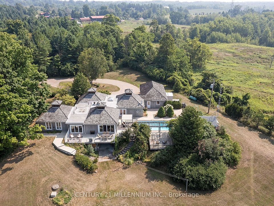 Your wait for paradise is over! This 17-acre property features two paved driveway entrances, a beautiful spring fed pond, complete privacy and an exquisite 4-bedroom, 3-bathroom home. Drive up the tree lined driveway as the stress of your day escapes you and is replaced by peaceful easy feelings. This custom build has a smart layout with stunning views from every window, and the primary suite will make you never want to leave it! The lovely kitchen is this centre of the design opening to a breakfast nook, library, and dining room, plus the bedroom wing of the home. The great room is bright and airy walking out to the inground saltwater pool and sun filled patio. The walk out lower level is home to a huge rec room, a full bathroom with a sauna, laundry and so much storage. Efficient Geothermal heating, five fireplaces, seven walkouts, chicken coop, veggie gardens, a sugar shack plus a small barn and acres to wander and relax. Only 35 minutes to the GTA, 8 minutes to the village of Erin and 20 minutes to Guelph. Your rural oasis is waiting for you, do not miss it!