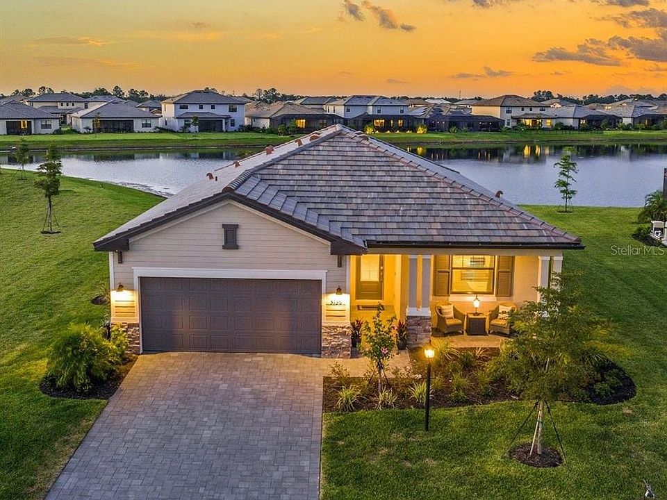 A water view to die for!!! This 3 bedroom 3 bath home has everything you need to feel like you are living the Florida dream. UPGRADES INCLUDE: Kitchen has brand new upgraded stainless appliances, granite countertops, gas stove, walk-in pantry, island, and shaker cabinets. Updated light fixtures and fans throughout house. Master bedroom has 2 Walk-in closets, tile flooring, views of the water, and ensuite bath with duals sinks and shower stall. Home is one almost a QUARTER OF AN ACRE with expansive water views. Among the additional upgrades of the house are: Gutters, Pavered driveway and lanai, Glass front door, Freshly painted entire interior, Tiled throughout - NO CARPETS!!!, Oversized lot with tons of space between neighbors. This gated maintenance-free neighborhood is another must have. COMMUNITY FEATURES include (some are still under construction): Clubhouse, Resort-Style Community Pool with Poolside Bar, Fitness Center, Aerobics Studio, Splash Park, Playground, Sport Court, Basketball Court, Volleyball Court, Lawn Maintenance included, Gates & Guardhouse.