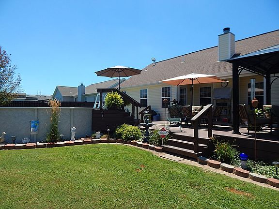 Back yard oasis with deck, covered area, above-ground Doughboy pool, 14 x 16 work shed with electric, alarm system, storm shelter, eat-in kitchen with dining area, hardwoods, spacious master bedroom with office area and access to back yard.