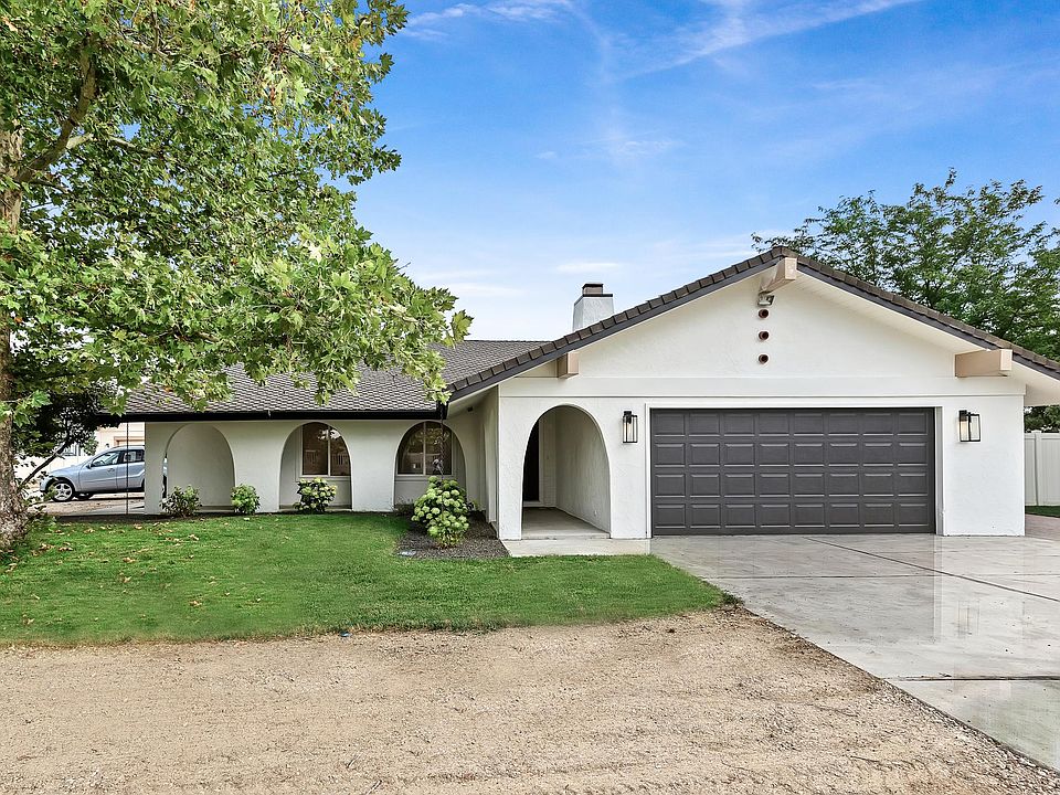 Fully remodeled 3-bedroom, 2-bathroom home with an additional office and a 2-car garage, spanning 1800 square feet. It also features a large 1600-square-foot insulated, heated/cooled shop with an RV bay and 220V electricity. There are no HOA or CC&Rs restrictions! The interior boasts modern finishes, custom cabinetry, imported tiles, quartz countertops, high vaulted ceilings, and a wood-burning fireplace in the spacious living area. The property sits on a fully fenced, landscaped, and irrigated 1-acre lot, offering plenty of space for animals, business equipment, or your Idaho toys. Connected to city water and sewer, this property offers both convenience and luxury. Renter is responsible for all utilities and landscape maintenance. Extra $300 will include weekly landscape maintenance.