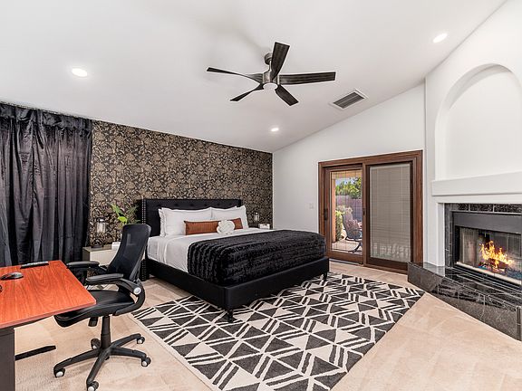 The master bedroom features a beautifully decorated king-size bed and a private en-suite bathroom. The bathroom has a deep soaking bathtub and a separate walk in shower. The master bedroom has a large walk in closet with plenty of space to organize your belongings. For your enjoyment and convenience there is also a Smart TV, a designated workspace area, your very own wood burning fireplace, and direct access to the backyard/ pool area.