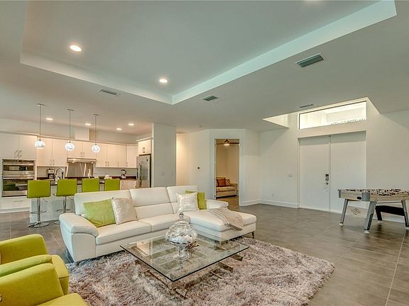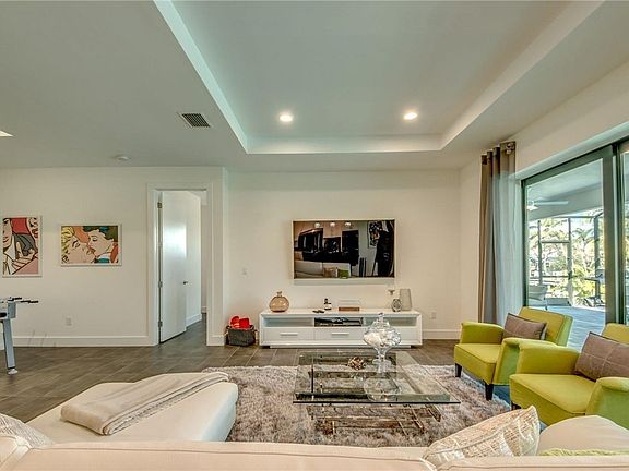 Contemporary Sailboat Access Home located in the popular Cape Coral Yacht Club neighborhood. This modern 2200 SF home offers an open floorplan with 3 bedrooms, 3 bathrooms and a DEN. The high-quality home was built by one Cape Coral's premiere contractors and features quartz countertops in the kitchen and bathrooms, porcelain tile floors throughout, 8 ft doors, very spacious rooms, hurricane impact windows, sliders & doors, smooth wall finish and smooth exterior stucco, LED lights throughout, a huge paved lanai, oversized heated pool w/ Jacuzzi and sun ledge, and a PVC boat dock with a 10k lb lift, captains walk and TIKI Hut. The house was professionally furnished and decorated and is offered TURNKEY. Currently in a very successful rental program, this property is the perfect fit for an investor. All Assessments are in and PAID! Don't miss out on the opportunity of owning a home very close to the new Yacht Club/ City Beach, the Bimini Square and The Cove - offering trendy restaurants and life style.