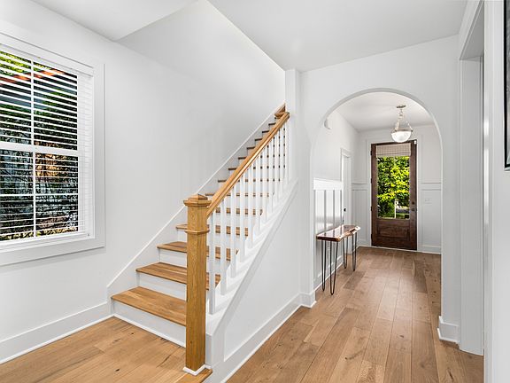 The primary suite is a true retreat, offering a soaring vaulted ceiling, dual oversized walk-in closets, and a spa-inspired bath with a large walk-in shower. Both secondary bedrooms include walk-in closets, providing ample storage. Throughout the home, you’ll find wide-plank hardwood floors and carefully curated designer fixtures.