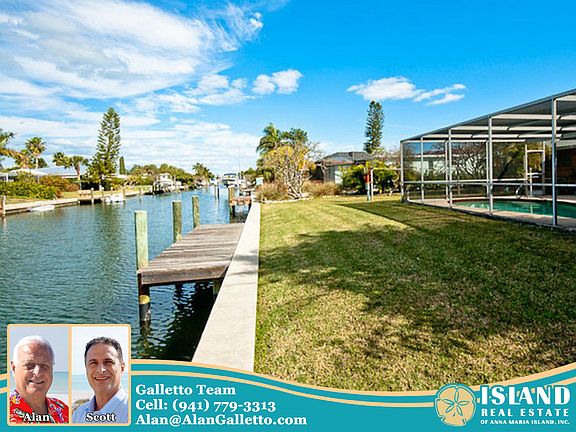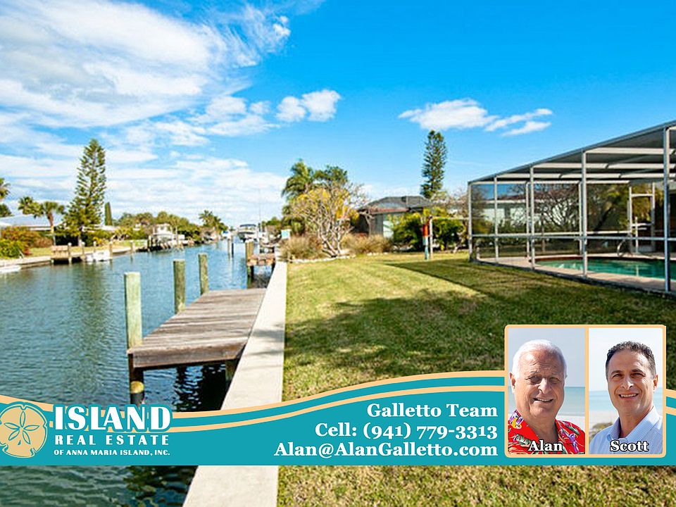 Ground level single family home from Anna Maria's past. Kick back and relax in this open, airy and charming 2 bedroom 2 bath island oasis with a third room that can be a den or bedroom for guests. Large Florida room that walks out to an enclosed pool area overlooking the canal. Makes a nice, clean vacation rental (1 month min) or home. The house is very tranquil and could comfortably accommodate 6. Offered unfurnished but negotiable. The pool is perfect. You will love the dock. Bring jet skis, a boat, kayaks or canoes and it is also a great place to sit and fish. The beach is about 3 blocks away, but a nice walk or a quick bike ride.