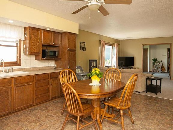Peaceful, small town living just minutes from Fargo-Moorhead. Updated rambler with spectacular east facing views with no front yard neighbors and private, fenced back yard. Open concept, eat-in kitchen leads to spacious living room. Relax in the adjacent sun room with sliding patio door. The master bedroom features oversize walk in closet, along with two additional bedrooms, each with ample storage. Large, updated full bath and laundry, huge utility room with back yard access. Super-size single garage, newer shingles and furnace, manicured lawn and only 10 minutes to Fargo-Moorhead make this country rambler like no other.