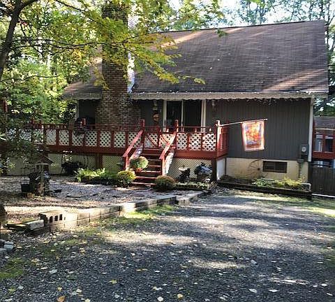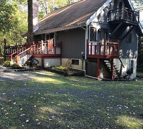 Chalet home is the perfect home or weekend get away with Cathedral Ceilings, Large Living Room with a Gorgeous Brick Fireplace and sliders that lead out to the Oversized decks to relax on with your morning coffee. Home is situated on 1 acre lot in the Beautiful Pocono Mountains. 24 X 21 Garage has electric. Low Taxes and No HOA fees. Close to shopping, Kalahari, Camelback, the Outlets, Blue Mountains, Hiking Trails, Mount Airy Casino Resort and the Pocono Race Way.