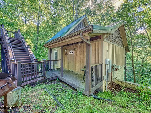 Private, 1 BD/1BA, chalet in the woods located super close to downtown Gatlinburg. Upon entering this well maintained unit, you will be greeted by a large great room with a warm gas fireplace along with a dining room for you and a few friends. The fully appointed kitchen ensures that you can relax without having to go out. The primary bedroom and bathroom are conveniently located on the main level, An additional king bed in the loft and a sleeper sofa on the main mean that this unit can sleep 6. The very nice covered porch with hot tub is a great place to relax. This chalet features unfinished square footage on a lower level that could be converted into additional living space. The Potential Is Here for the short term rental operator or someone looking for the privacy of a forest/partial mountain view retreat with Great Proximity to Gatlinburg.