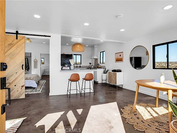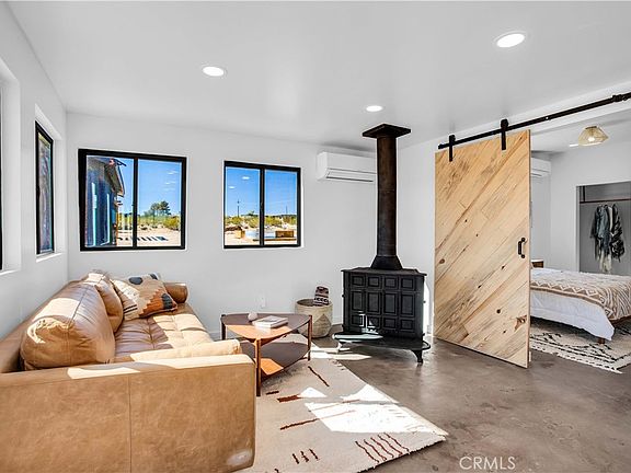 Escape to your fully furnished private desert getaway with this stunning, newly remodeled home nestled on 5 serene acres in the desirable North Joshua Tree area. Ensuring the ultimate in privacy, this property is surrounded by approximately 152 acres of untouched government land, offering a secluded retreat from the hustle and bustle of everyday life. As you approach the property, you will be captivated by the expansive natural surroundings that promise a lifestyle of tranquility and peace. The home itself has undergone a comprehensive renovation, boasting everything brand new and state-of-the-art. From the gleaming windows that flood the space with natural light to the efficient mini-split system, every detail has been meticulously crafted for your comfort. Step inside to discover a sleek interior that features new appliances that modernize your living experience. The kitchen is a chef's dream with pristine new countertops, custom cabinetry, and a layout that makes cooking and entertaining a delight. An open-plan living area is anchored by a vintage wood stove, adding warmth and charm to the space. Retire to your spacious bedroom after a long day, where the large windows frame mesmerizing views of the desert landscape. This personal haven is complemented by an ensuite bathroom that exudes luxury, complete with double vanity sinks, a stylish standing shower with chic tile work, and a brand-new freestanding tub for soaking away your cares. Outside, the wonders of this property continue. A detached one-car garage provides practical storage and space for your vehicle or desert toys. The outdoor area is an adventure in itself, with a fire pit for enchanting desert evenings, a raised deck for lounging under the sun, and a cowboy pool for refreshing dips on hot days. Dine al fresco under the pergola as you take in the breathtaking views, or simply marvel at the cosmos in your own stargazing area - a true delight in the clear desert nights. This North Joshua Tree gem is a rare find, offering not just a home but a lifestyle. Here, every day is an opportunity to connect with nature while enjoying the modern comforts of a beautifully remodeled residence. Don't miss out on the chance to own this desert sanctuary, where your dreams of a peaceful, private, and picturesque desert life become reality.