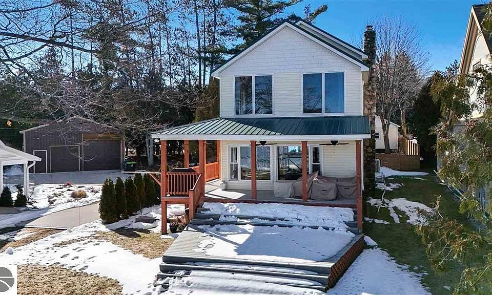 On the beautiful shores of Lake Charlevoix you will find a lovely retreat! Welcome to 514 Lake Street, East Jordan! This parcel welcomes you with so much opportunity! Home features 3 bedrooms, a very large upper level loft, 2 full bathrooms, a main floor half bath just to begin your tour! A lovely den greets you as you enter with gorgeous hardwood flooring that leads you into and through the open kitchen and dining areas! With plenty of space for the family to get comfy, everyone will absolutely love the living room that is also complimented with a stone fireplace w/wood burning insert! Enjoy the fire, enjoy the views, turn on the BIG game and relax here! The wrap around covered deck and platform decking are all complete with composite decking all leading you to a lovely and easy grade to the water’s edge! Additional features include: 2 newer mini splits, 170’ of customizable decking, sprinkler system & pump, newer fenced in back yard, invisible dog fence, detached 2 car garage, high speed internet and an easy drive to dining & shopping anywhere you choose! To top this all off, home is being offered furnished! However, don’t wait too long on this one…. Expecting this charmer to get scooped up quick!