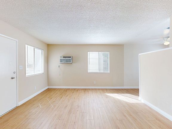Upon entering the unit, you will immediately notice the open-layout living area, featuring warm wood-style vinyl plank flooring throughout, fresh paint, and built-in shelving for added storage. Large windows fill the unit with sunlight, while the wall A/C and ceiling fans help keep you comfortable year-round.