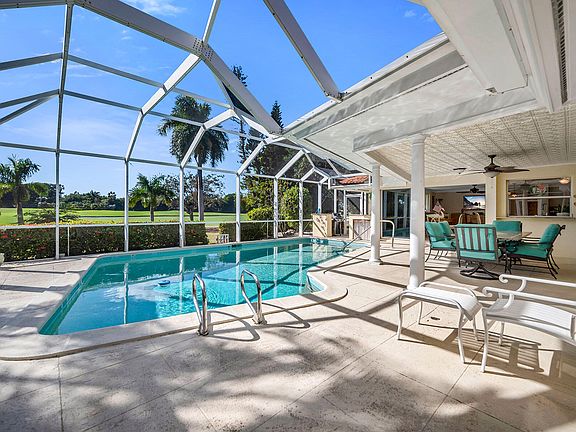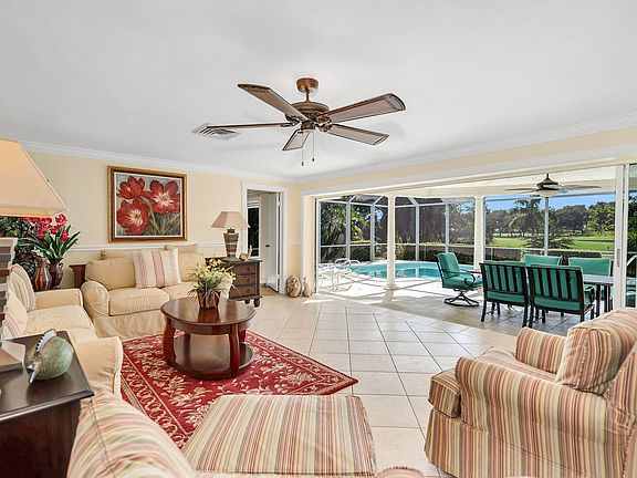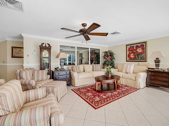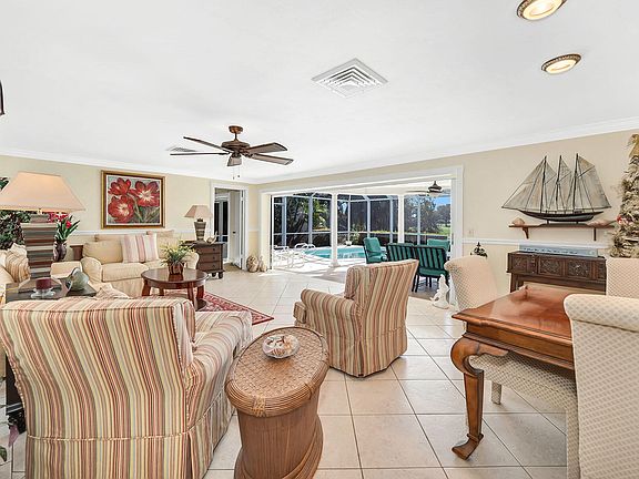 Enjoy breathtaking views across the Island Country Club's 9th green and fairway, framed by mature trees, lush landscaping, and a tranquil lake, from this beautifully positioned residence with coveted southwest rear exposure. Set on an oversized lot of approximately one-third acre, the property offers exceptional privacy and added outdoor space, creating a serene backdrop for relaxed Marco Island living. The thoughtfully designed floor plan features three bedrooms, three baths, and a two-car garage, with diagonal tile flooring and crown molding enhancing the main living areas. The kitchen is well-appointed with granite countertops, a tile backsplash, and a bar counter with seating, complemented by accent pendant lighting and appliances including a range, microwave, dishwasher, and refrigerator with icemaker. Both the living room and family room open seamlessly to the lanai, capturing sweeping golf course views and reinforcing the home's inviting indoor-outdoor lifestyle. The spacious primary bedroom offers private lanai access and peaceful views, along with an en-suite bath featuring a large vanity with full-width mirrors and a walk-in shower. Two additional guest bedrooms are generously sized, each with ceiling fans, including one with dual closets, and are served by a guest bath with a tub-shower combination. Outdoor living is a highlight, with a large screened lanai featuring tile flooring, a ceiling fan, and ample space for entertaining or relaxing poolside. The solar-heated pool overlooks the golf course, offering an ideal setting to enjoy sunsets and serene views. A generously sized laundry room provides added convenience with a top-load washer, front-load dryer, overhead cabinetry, and additional closet storage. Recent updates include a new A/C condenser and air handler replaced in 2025. Ideally located just moments from the members-only Island Country Club, this residence combines privacy, picturesque views, and close proximity to premier amenities, making it a standout opportunity for enjoying the best of the Marco Island lifestyle.