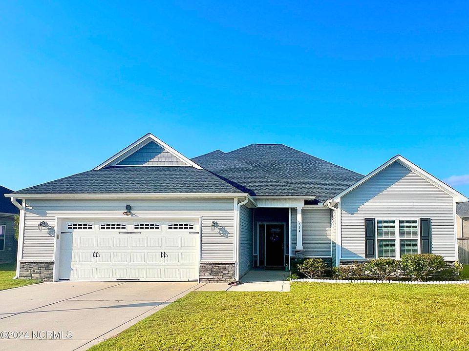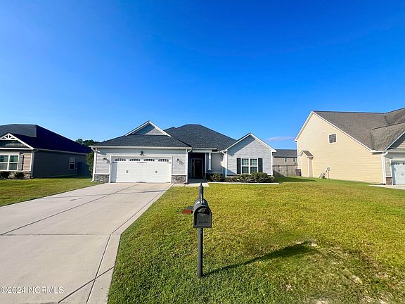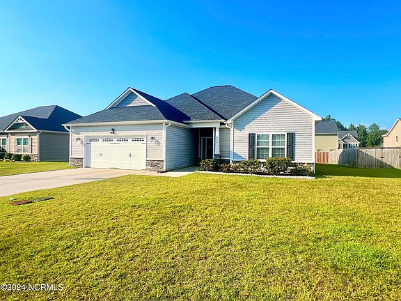 Welcome to 514 New Hanover Trail, a beautifully maintained home located just a short drive from Camp Lejeune Marine Base and Jacksonville. This charming residence, built in 2015, offers 1,962 square feet of comfortable living space designed to meet all your needs. As you enter, you'll be greeted by a spacious living room, perfect for relaxing or entertaining guests. The heart of the home boasts a large primary suite that offers a private retreat, complete with ample closet space and a well-appointed ensuite bathroom. Bedrooms two and three are equally spacious, providing plenty of room for family or guests. The kitchen is well-equipped and flows seamlessly into the living and dining areas, making it ideal for both everyday living and special occasions. Step outside to the covered back patio, where you can enjoy outdoor dining or simply unwind after a long day. Additional features include a 2-car garage, offering plenty of storage and convenience. This home is move-in ready and has been meticulously cared for, ensuring that all you have to do is unpack and start making memories. Don't miss the opportunity to make this lovely property your new home!