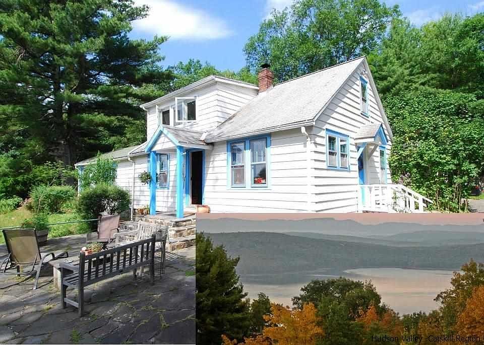 Up on high, with a double tiered massive yard, on a beautiful peaceful scenic Woodstock Rd., this home enjoys year round Ashokan reservoir views and has that perfect characterful Woodstock Je ne sais quoi! Beamed ceilings, gorgeous hard wood floors, cute as a button 50's kitchen, open floor plan for common spaces, separate master bedroom with ensuite bath upstairs, two lovely bedrooms and bath downstairs... and to top it all off, there is another room at the back of the house that is open to interpretation, it enjoys its own outside door, as does one of the other downstairs bedrooms. The configuration of the rooms makes living outside in warmer months, easy and breezy!! Largely on one level, the house feels super spacious, with the bedrooms nicely tucked away from each other, and from the common areas. This home has been loved and cared for by the same family for generations and the home has always been maintained well. Recently, for example, the owner has installed a brand new heating system and fuel tank. A UV filtration system was added, new patio and steps in front of retaining wall leading to the lower meadow, new washing machine and new range, painting, and new Bilco doors, all new windows upstairs, and the list goes on. Under the siding there should be nice wood siding, for a more country look. However, the house is super adorable in its current state, in need of updates mostly in kitchen and baths... but with a setting like this one, this agent is thoroughly convinced of its ability for nice appreciation. Come see for yourselves!