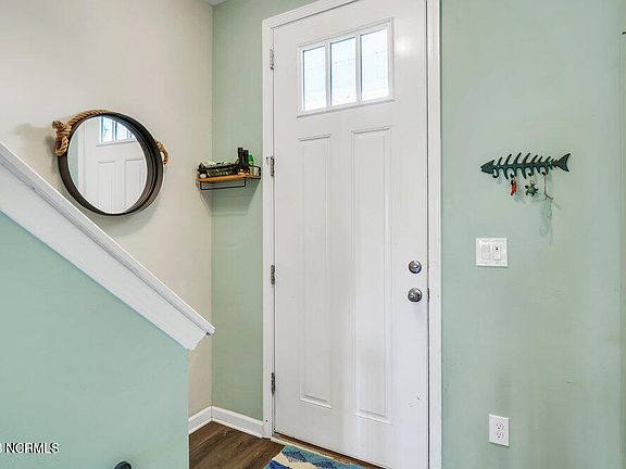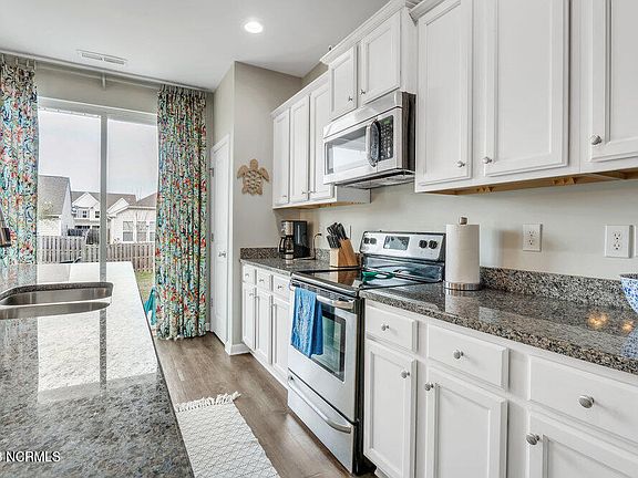 This 3 bedroom, 2.5 bath two-story townhome features an open concept floor plan with the main living areas on the bottom level. Past the main entrance and second-floor staircase is a coat closet, half bathroom, and living room. The kitchen sits at the rear of the townhome and has cabinets upgraded with trim, a new Delta faucet, and an island overlooking the dining room, which has professionally installed designer drapes. A smart switch (turn on the outdoor lights from your phone) is at the front door and décora style switches are located throughout. The bedrooms and 2 full bathrooms are on the second level, along with the laundry closet. The primary suite includes a walk-in closet, double vanity, soaking tub, and separate shower. The powder room and primary suite have bidets. At the rear of the home is a patio and inside the 1-car garage are upper-level cabinets, great for storing tools, paints, off-season supplies, etc. The Reserve at West Bay Estates Townhomes is convenient to area shopping, dining, and Wrightsville Beach.