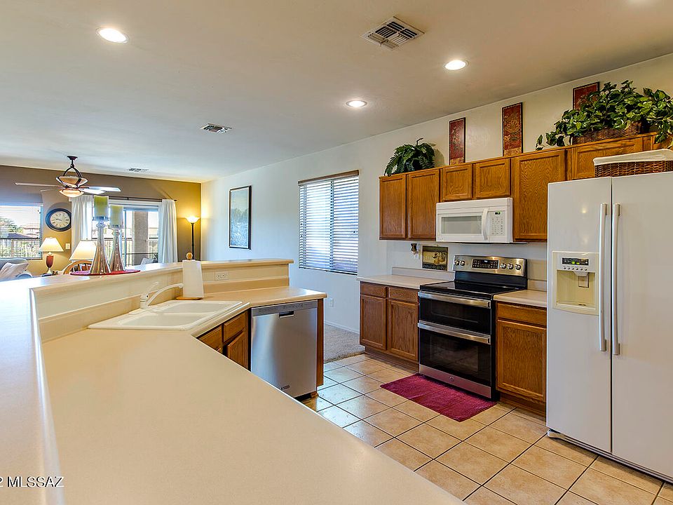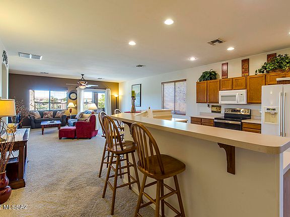 Beautiful Santa Rita Ranch home on Premium elevated lot with open desert behind! Upgrades galore, include paid Solar PV system, heated pool & spa improvements, back yard upgrades, new double SS oven & more! Large open kitchen with breakfast bar. Split bedroom plan with Walk-in closet in Master. Separate shower & soaking tub in Master bath. Covered & gated patio overlooks heated pebble tec pool & spa. Surrounded by mountain views the backyard has new low care artificial turf along with citrus & pomegranate trees. SAVE 100S PER MONTH ON ELECTRIC BILLS! Don't miss this great opportunity!