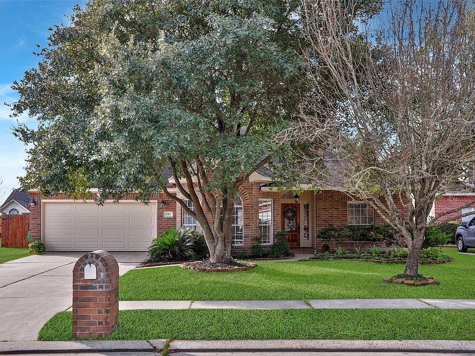 Charming one story home in Oakridge Forest. Nicely landscaped with covered front porch. Home sits on an oversized lot. Well maintained home with an open floor plan. Study with French doors off the foyer. Study has an open shelving area that could be easily closed off for a 4th bedroom. Large kitchen with eat in breakfast area, breakfast bar, gas range and views into the dining room and den. Den with corner fireplace. Bedrooms offer a split plan. Primary bedroom and en-suite offers double sinks, Separate shower and garden tub. 2 bedrooms and bath located off den on the right. Covered back patio is equipped with gas connections for a barbeque. Above ground pool for those hot summer days. Granite in kitchen and baths. Wood laminate flooring or tile throughout. NO carpet. Lot extends past the fence on the left side of the home.