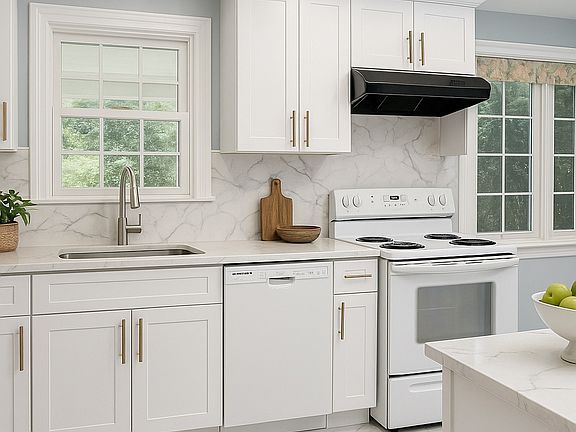 Modern Kitchen: White shaker cabinets, quartz countertops, stainless steel appliances, and ample storage ideal for home cooking and entertaining.